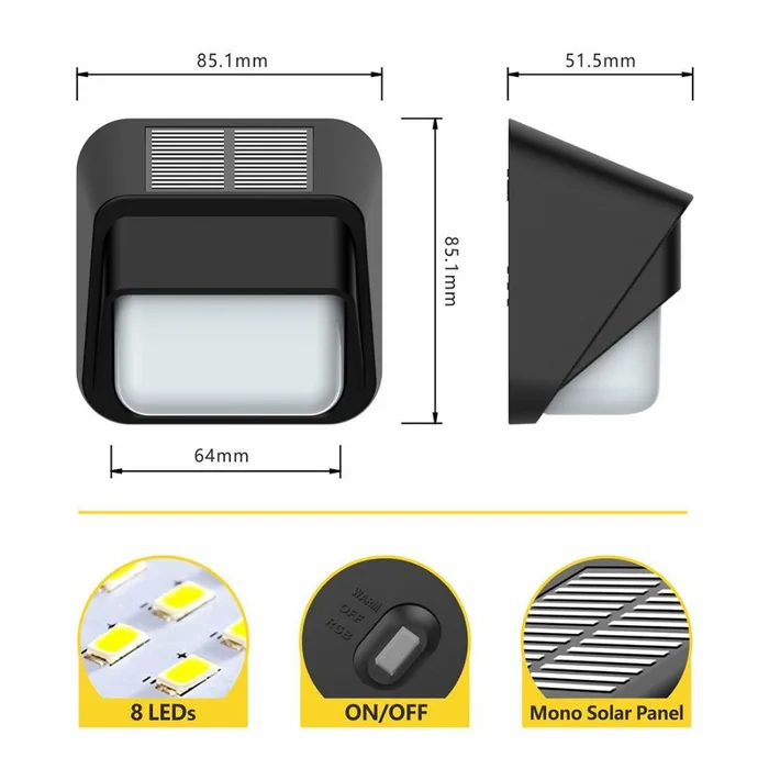 גוף תאורה צמוד קיר מוגן מים סולארי. אור לבן חם (3000K) או צבעוני (RGB) לבחירה. מושלם לסימון וקישוט שבילים, מרפסת, גינה, חצר, אולם אירועים, בית קפה, פאב, מסעדה ועוד